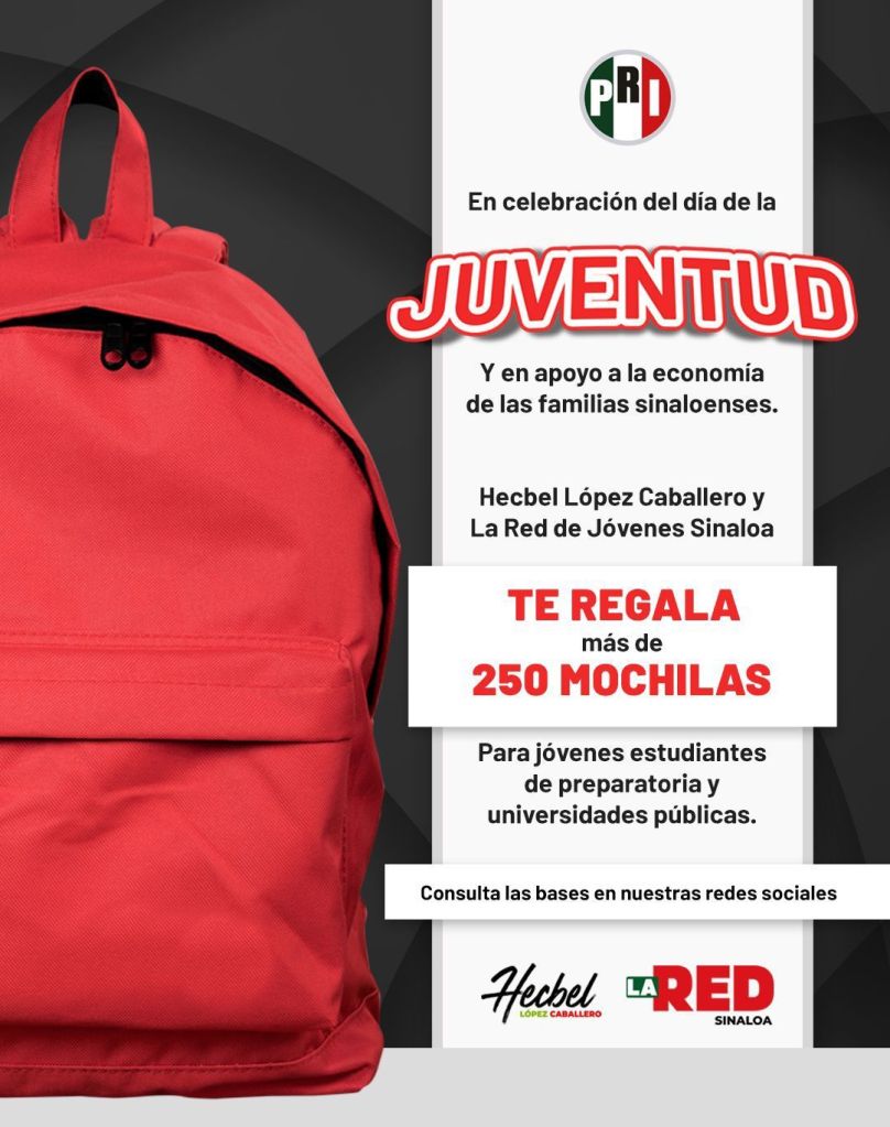 Culiacán, Sin. , miércoles 14 de agosto de 2024.- Dentro del marco de la celebración del Día de la Juventud, el PRI y la RED de Jóvenes Sinaloa, te obsequiarán más de 250 mochilas para este regreso a clases.