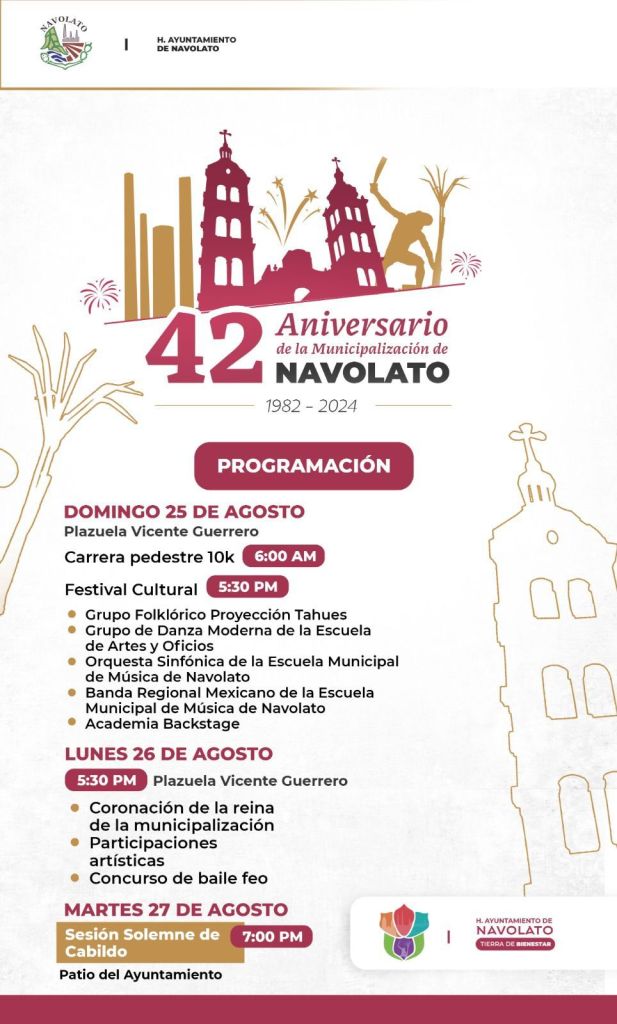 El Ayuntamiento de Navolato se complace en invitar a todas y todos los ciudadanos a unirse a la celebración por el 42 Aniversario de la Municipalización, que se llevará a cabo del 25 al 27 de agosto.