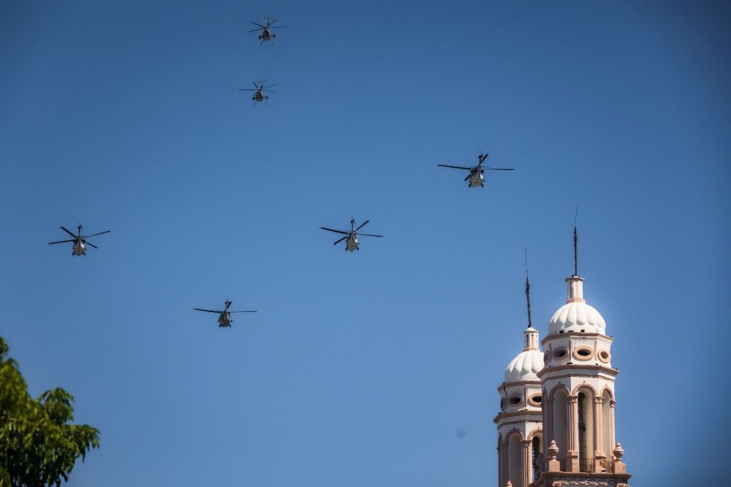 La exhibición por parte de la Fuerza Aérea Mexicana con aviones Texas y helicópteros artillados Blackhawk, que realizaron recorridos durante el desfile militar fue de lo más destacado del evento, al mostrar formaciones aéreas que fueron observadas desde distintos puntos de la capital.