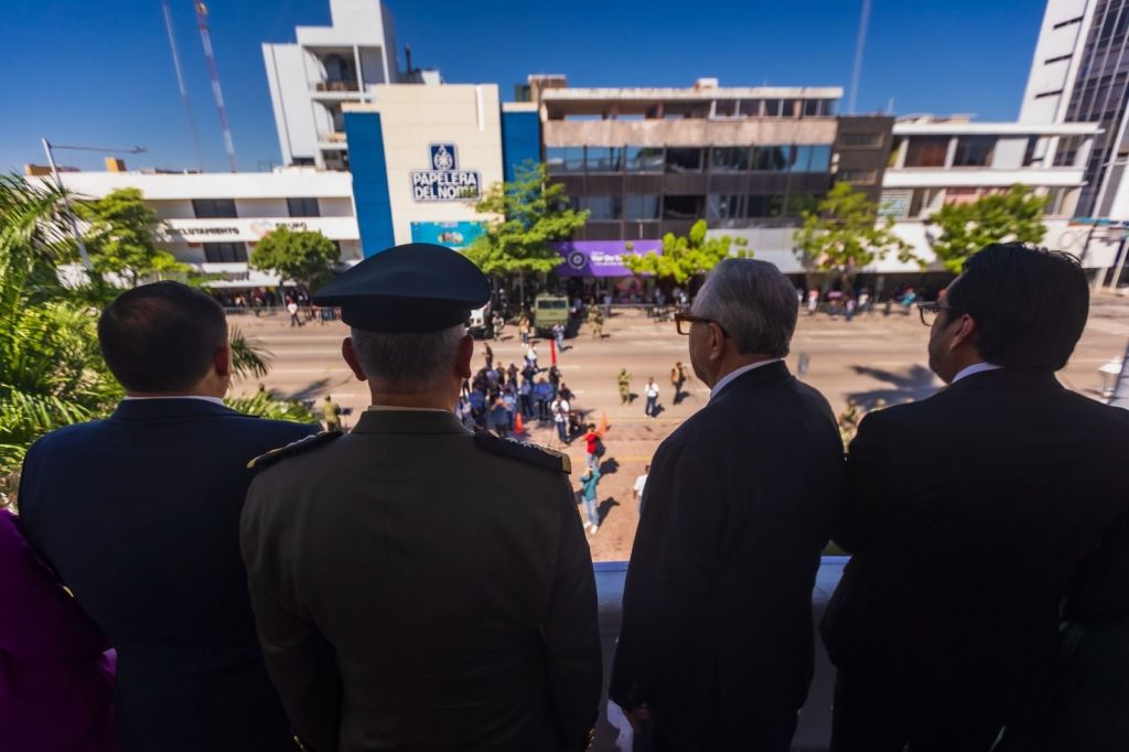 El Alcalde Juan de Dios Gámez Mendívil, brindó la bienvenida al mandatario estatal y su comitiva, así como a las autoridades legislativas, federales y judiciales, quienes acompañados por el cuerpo de Regidores del Cabildo Municipal observaron atentamente el paso de los elementos tanto del Ejército Mexicano, Fuerza Aérea, Marina Armada de México, Guardia Nacional, Policía Estatal y Policía Municipal, que participaron en la columna.