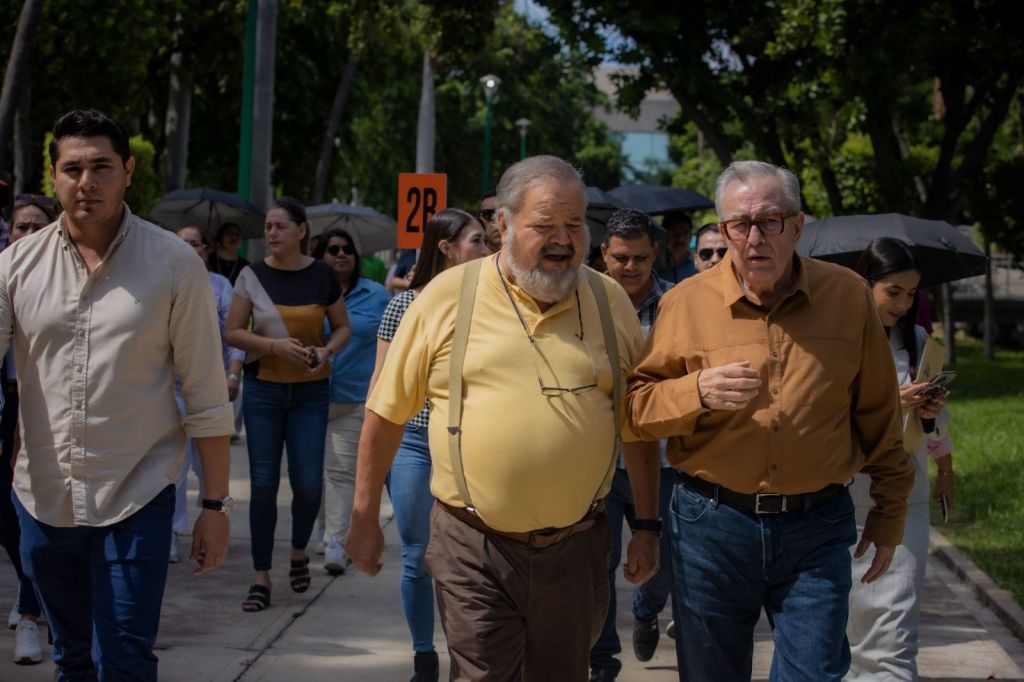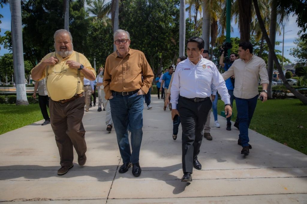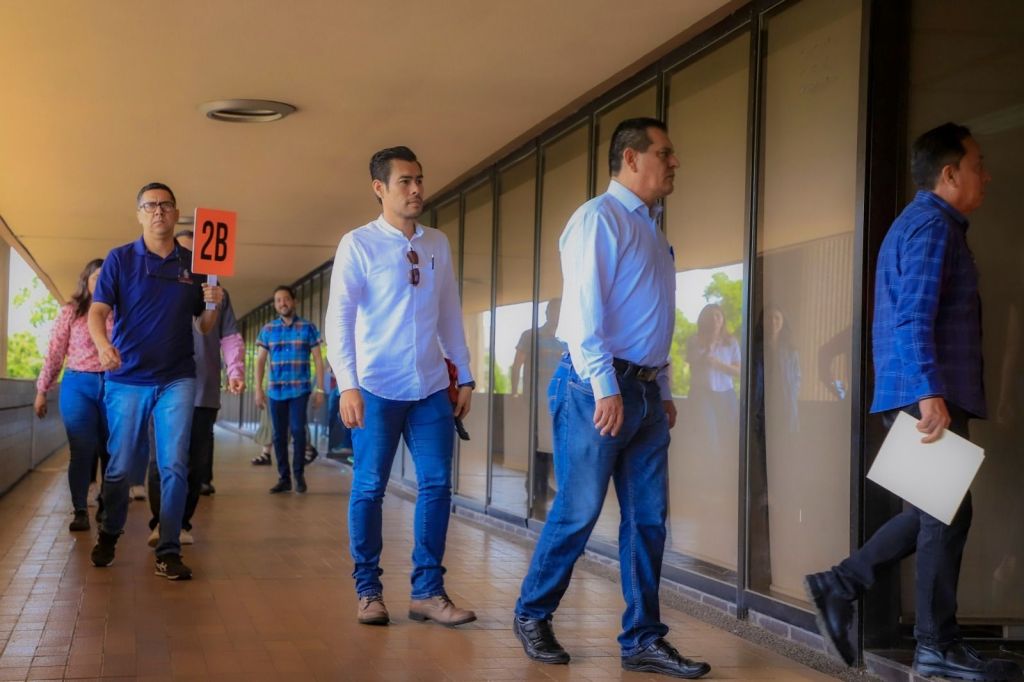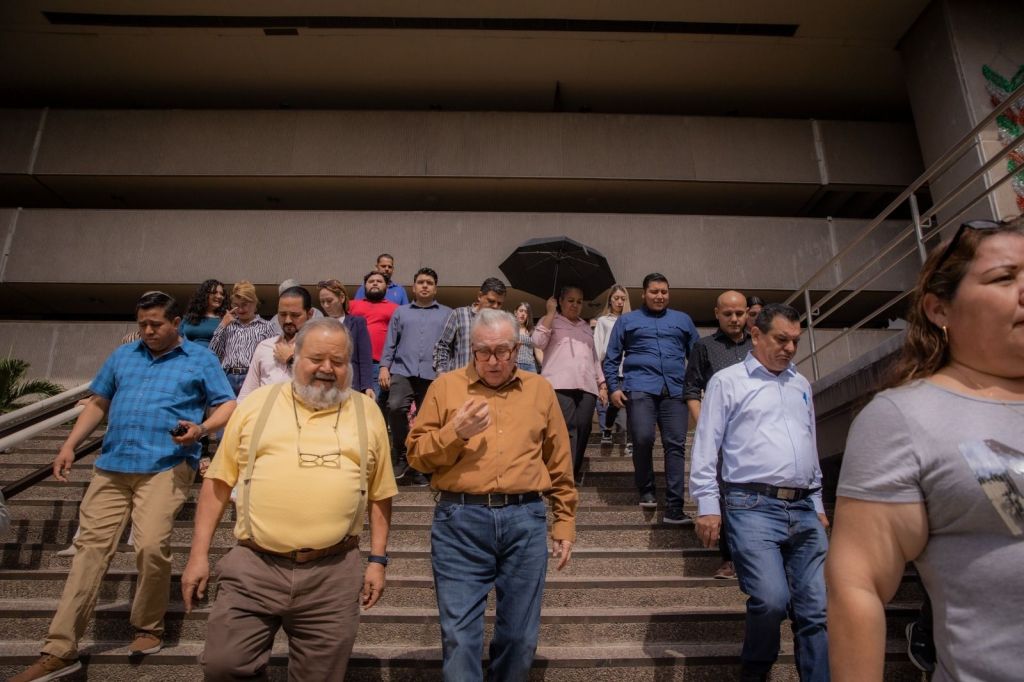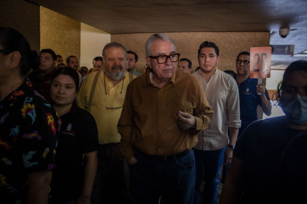 El gobernador Rubén Rocha Moya también participó en el simulacro como un trabajador más de Palacio de Gobierno.