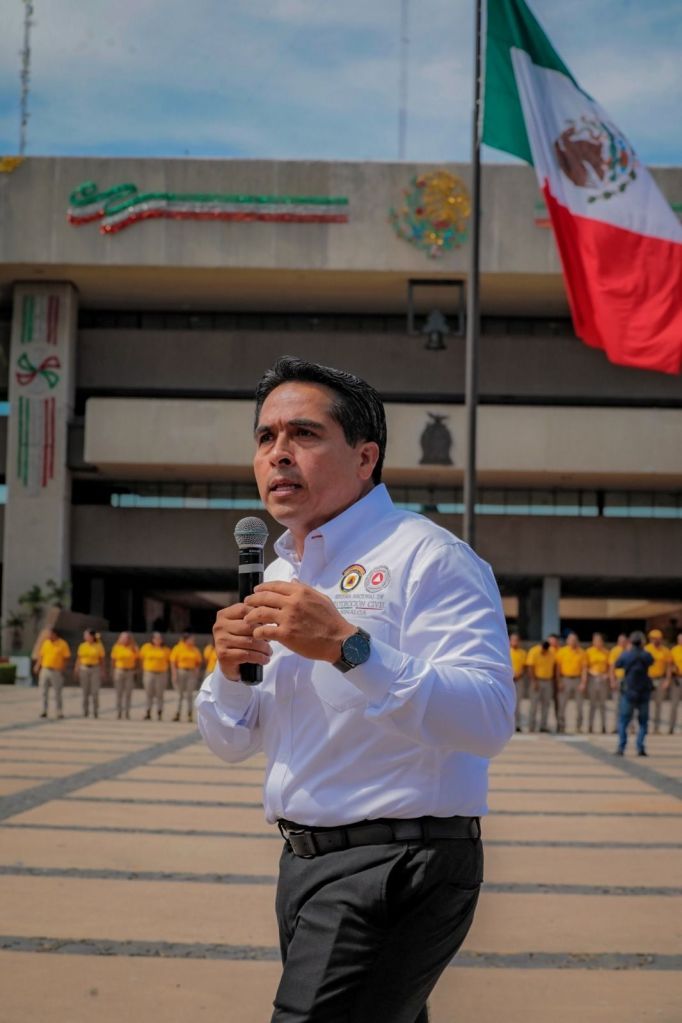Ya una vez situados en la explanada, el director del Instituto Estatal de Protección Civil, Roy Navarrete Cuevas, rindió un informe de este ejercicio y felicitó a todo el personal de Palacio de Gobierno porque se logró mejorar el tiempo de reacción.