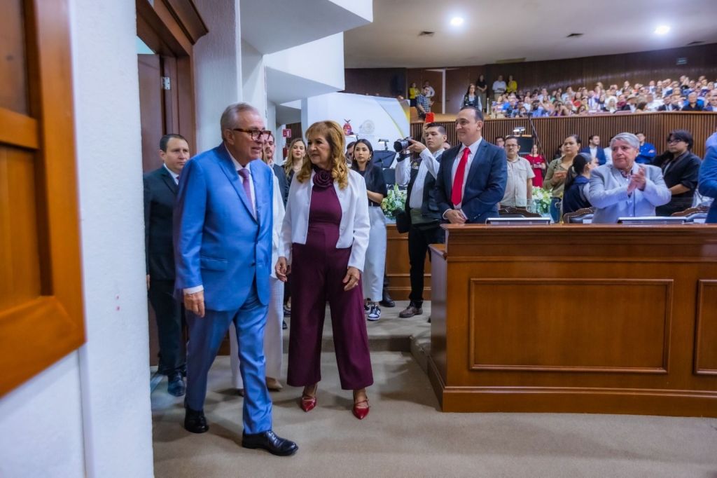 Conducida por Gloria Himelda Félix Niebla, Presidente saliente de la Mesa Directiva, durante este importante acto protocolario, el mandatario estatal saludó de mano a cada uno de los diputados que tomaron protesta este día, felicitando de manera especial a Geraldine Bonilla Valverde, designada nueva Presidenta de la Mesa Directiva, órgano conductor de las sesiones legislativas.