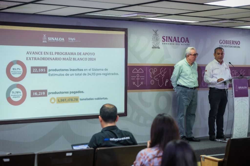 Culiacán, Sinaloa, a 07 de octubre 2024.- Durante la Conferencia Semanera del gobernador Rubén Rocha Moya, el subsecretario de Agricultura, Ramón Gallegos Araiza, dio a conocer el reporte al día de ayer del programa de apoyo a la comercialización, tanto del maíz como del trigo, y en el primero de ellos informó que ya son un total de 16 mil 219 productores quienes han recibido su apoyo de 750 pesos por tonelada de maíz, lo que representa alrededor del 72 por ciento de avance del total de productores registrados.