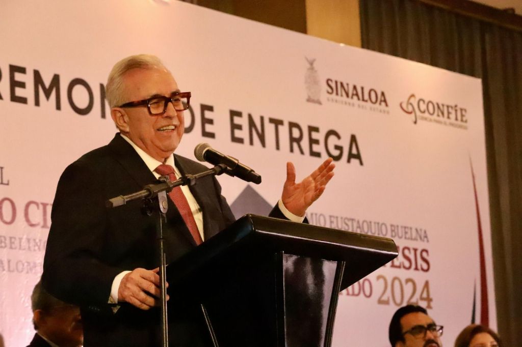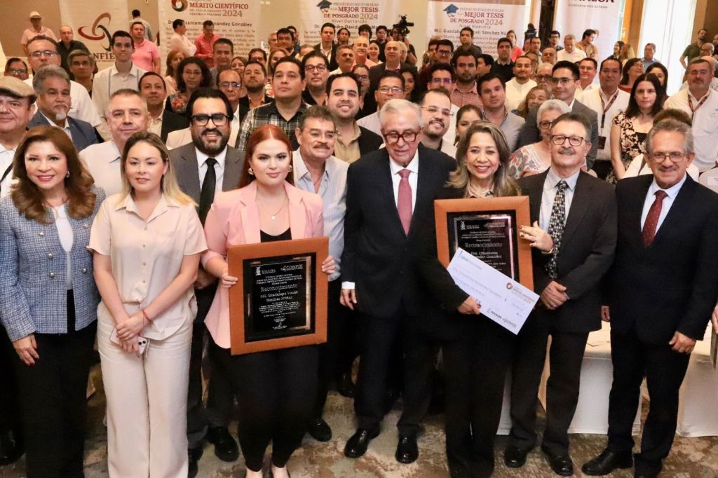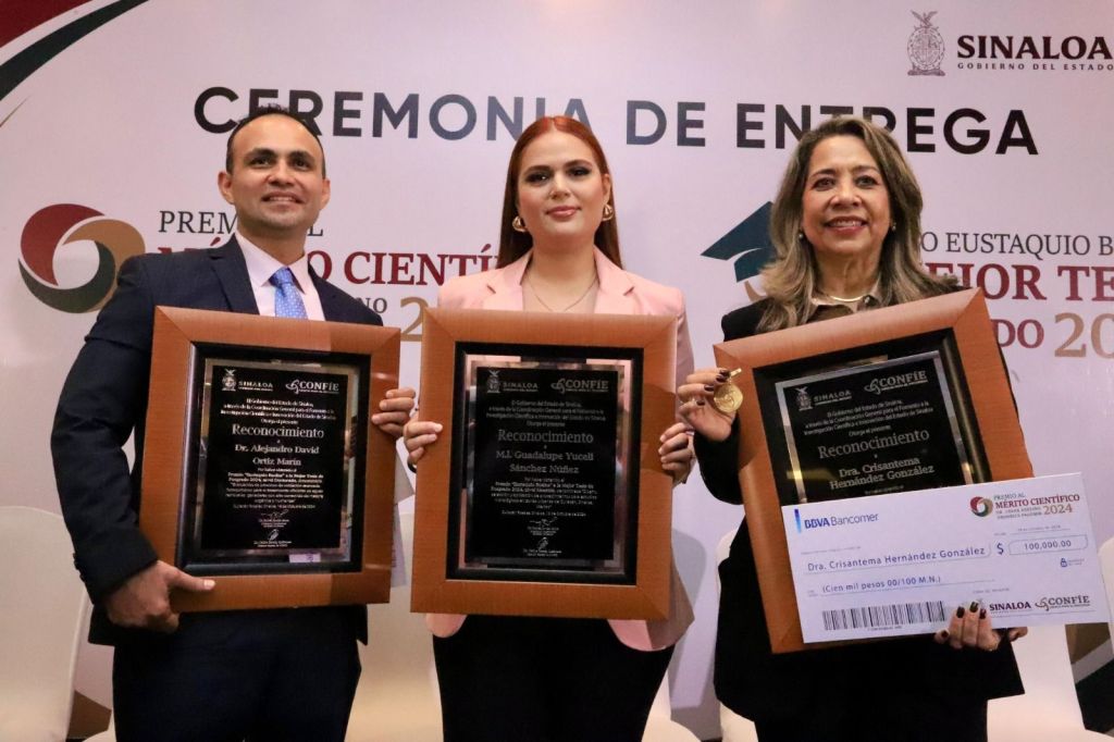 Culiacán, Sinaloa 18 de octubre de 2024.- Reconociendo las contribuciones excepcionales y el sobresaliente desempeño en el área de ciencia y tecnología en materia de desarrollo científico, tecnológico e innovación de la comunidad científica sinaloense, el Gobernador Rubén Rocha Moya, acompañado del Alcalde Juan de Dios Gámez, la Diputada Geraldine Bonilla, la Secretaria de Educación Pública Gloria Himelda Félix y el Coordinación General para el Fomento a la Investigación Científica e Innovación del Estado de Sinaloa (CONFIE) Carlos Karam Quiñones entregaron el Premio al Mérito Científico 2024 “Dr. Cesar Abelino Ordorica Falomir” a la Dra. Crisantema Hernández González y el Premio “Eustaquio Buelna” a la Mejor Tesis de Posgrado al Dr. Alejandro David Ortiz Marín en nivel doctorado y la Mtra Guadalupe Yuceli Sánchez Núñez en nivel Maestría.