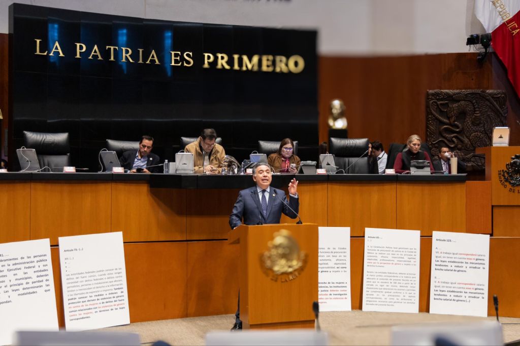 CDMX; 24 de octubre de 2024.- Desde la tribuna de la cámara alta, el senador Enrique Inzunza señaló que el decreto por el que se reforman diversos artículos de la Constitución Política de los Estados Unidos Mexicanos, en materia de Igualdad Sustantiva, perspectiva de género, derecho de las mujeres a una vida libre de violencias y erradicación de la brecha salarial por razones de género, propone modificaciones que representan un acontecimiento fundamental y revolucionario en la lucha por la igualdad y la protección de los derechos.
