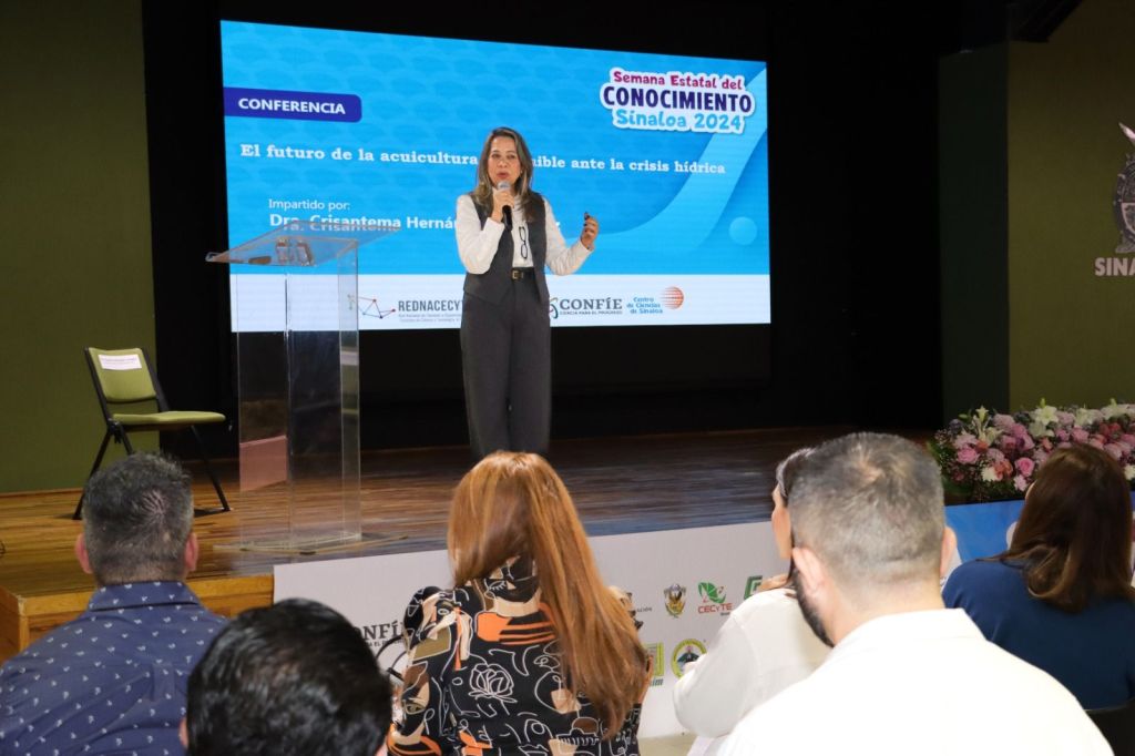 Culiacán, Sinaloa, 4 de noviembre de 2024. La ciencia es la llave del crecimiento económico, social y sustentable de un país, puntualizó la Dra. Crisantema Hernández González, ganadora del Premio al Mérito Científico “Dr. César Abelino Ordorica Falomir” 2024, al disertar la conferencia magistral “El futuro de la acuicultura sostenible ante la crisis hídrica” en el marco de la inauguración de la Semana Estatal del Conocimiento Sinaloa 2024 y la Cuarta Semana Nacional del Conocimiento y la Innovación.
