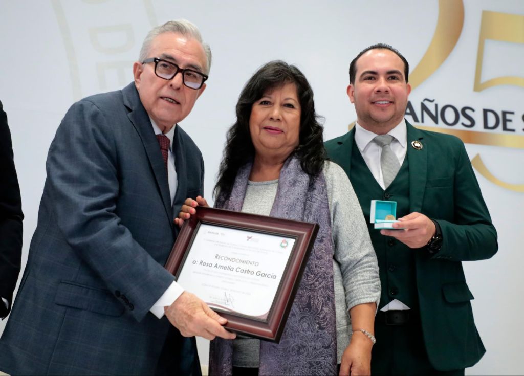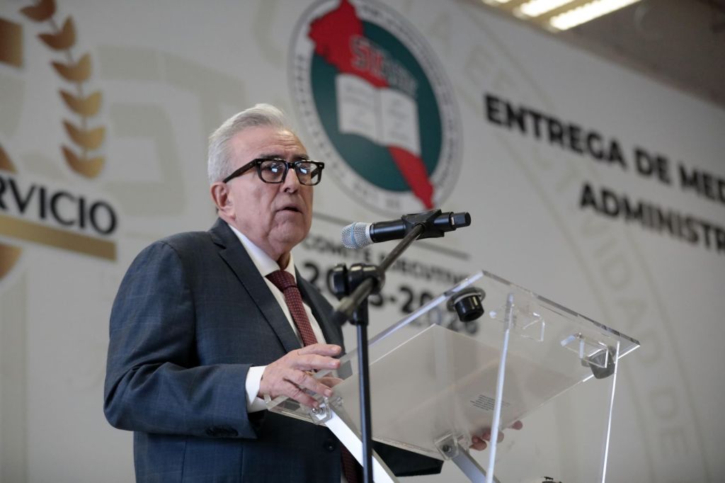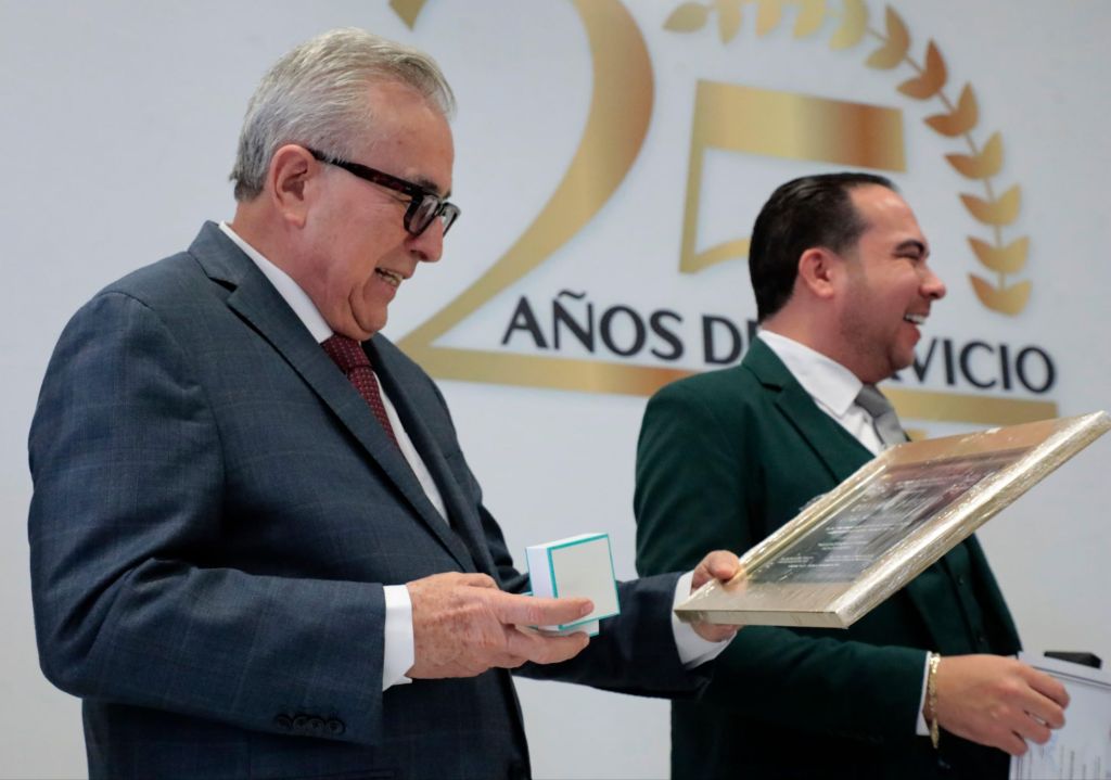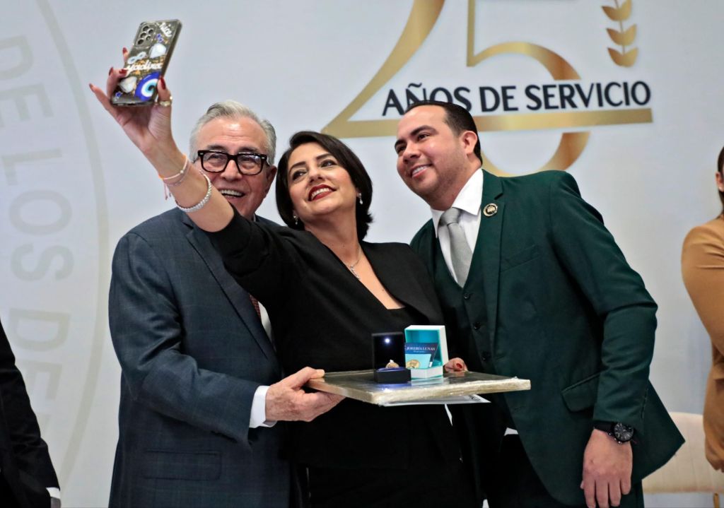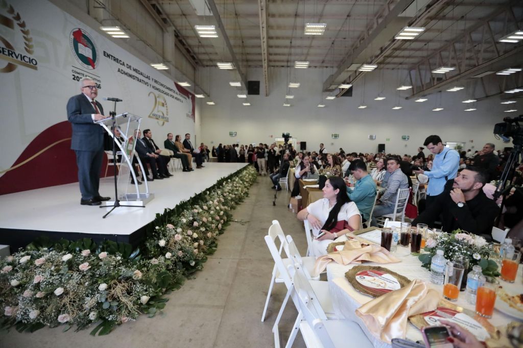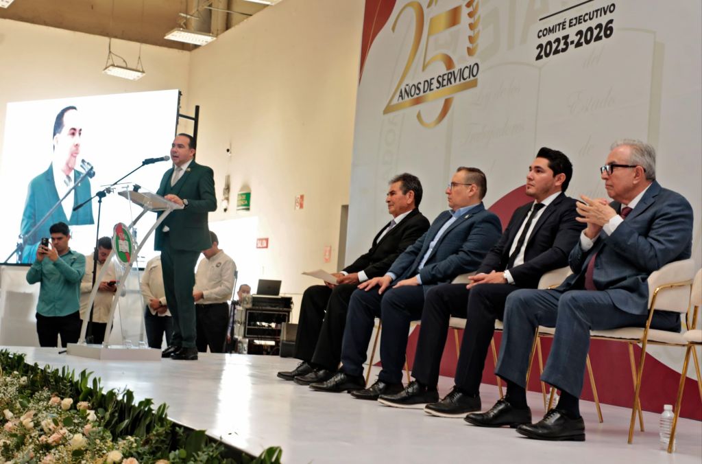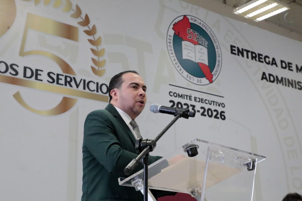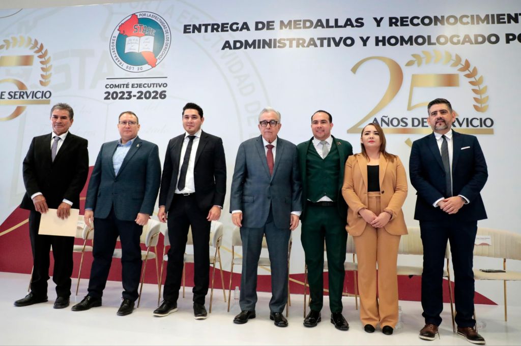 “Es un honor estar celebrando a todos los compañeros, a las y los galardonados; las autoridades de los tres Poderes del Estado y el Sindicato de Trabajadores al Servicio del Estado, reconocemos su trayectoria frente al servicio público por los años de trabajo, de esfuerzo, de dedicación, y de compromiso. Ustedes han contribuido al funcionamiento y fortalecimiento de las instituciones porque son la maquinaria del servicio público, su trabajo es el pilar que sostiene el aparato gubernamental del Estado, a cada uno de ustedes les extiendo mi más sincero agradecimiento, pues son el ejemplo de la cultura del trabajo y responsabilidad de nuestro sindicato”, dijo.