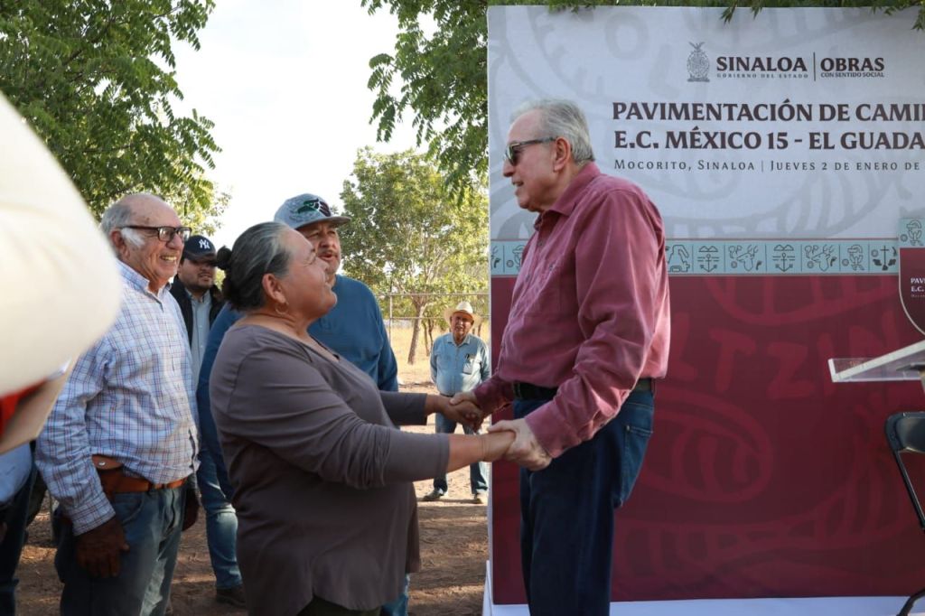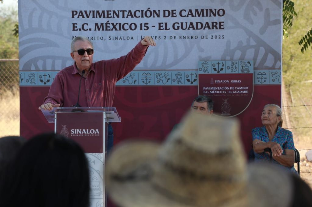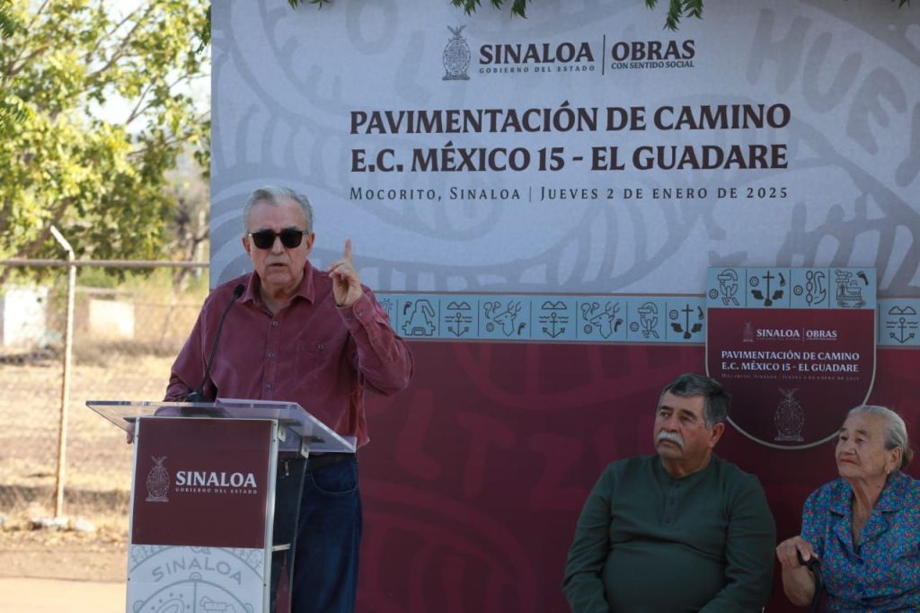 El Guadare, Mocorito, Sinaloa, a 2 de enero de 2025.- Tal como concluyó el 2024, el gobernador Rubén Rocha Moya empezó este nuevo año con la inauguración de una carretera más que viene a comunicar a pequeñas poblaciones rurales que por décadas habían estado en el olvido, como en esta ocasión El Guadare, en el municipio de Mocorito, cuyos habitantes ahora ya cuentan con una vía de acceso pavimentada hasta el entronque con la carretera Internacional México 15.