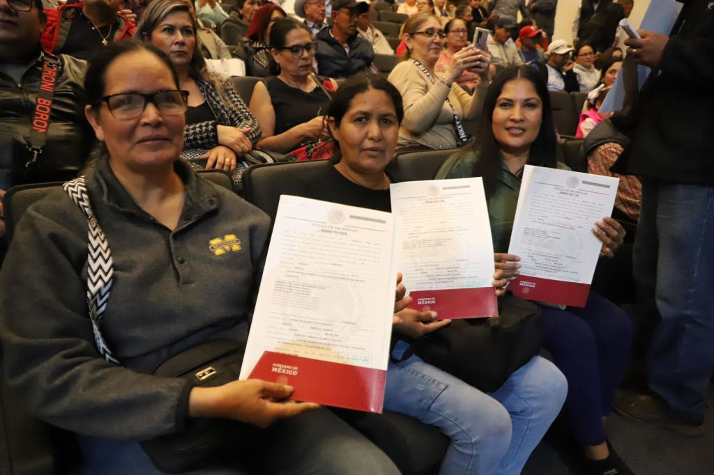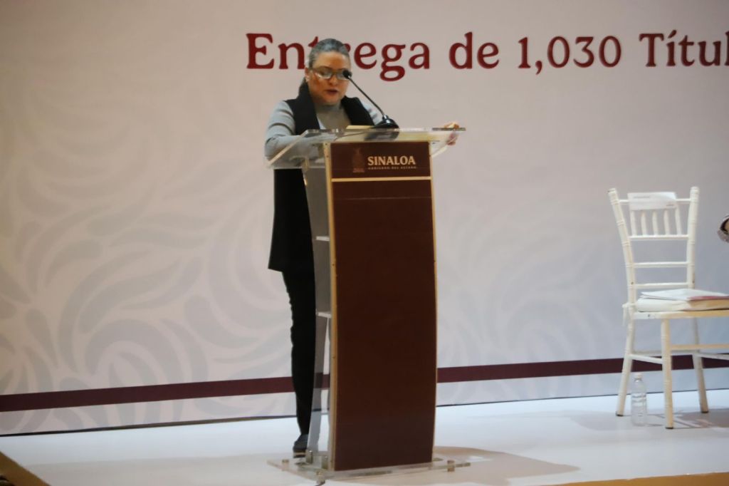 Puntualizó que las entregas de títulos, es gracias al humanismo del Gobernador Dr Rubén Rocha y la Presidenta Claudia Sheinbaum y a cada uno de los organismos a quien reconoció por la coordinación que se ha tenido desde el primer momento en que se llevó a cabo estás entregas.