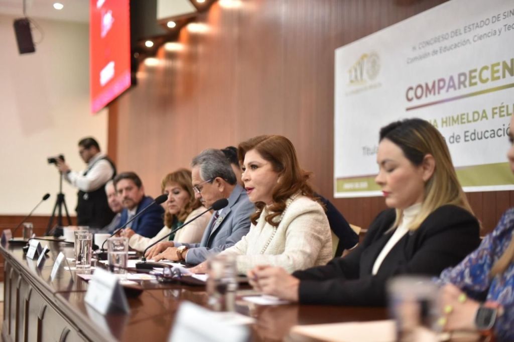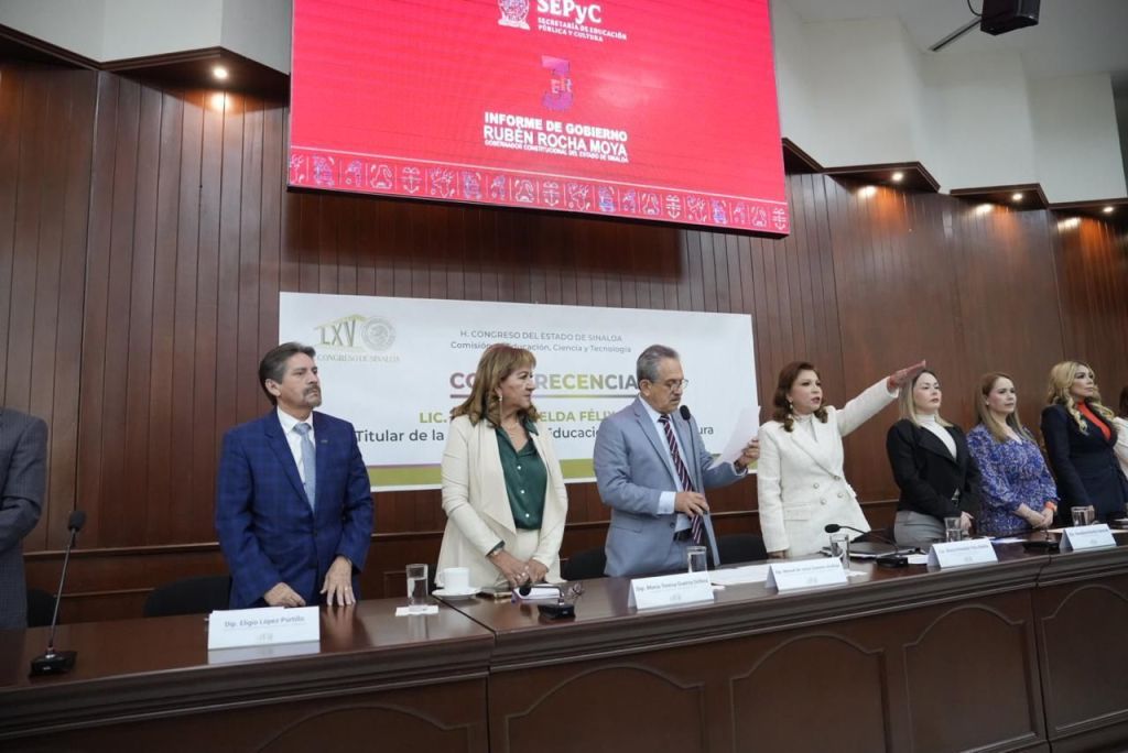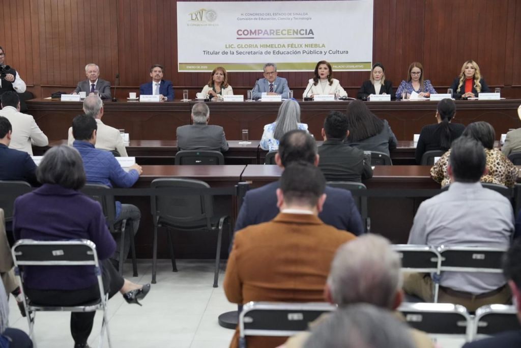 La comparecencia de la titular de la Secretaría de Educación Pública y Cultura, Gloria Himelda Félix Niebla, fue encabezada por las y los integrantes de la Comisión de Educación, Ciencia y Tecnología del Congreso del Estado, y las diputadas María Teresa Guerra Ochoa y Yeraldine Bonilla Valverde, presidentas de la Junta de Coordinación Política y de la Mesa Directiva del Congreso del Estado.