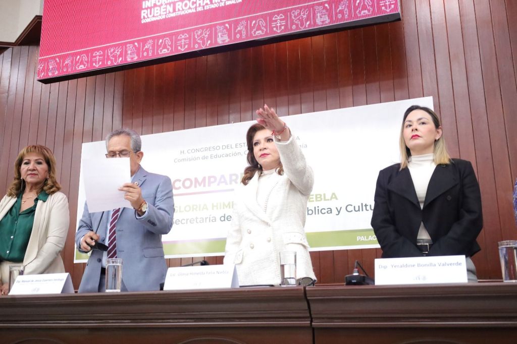 La titular de la SEPyC resaltó en su comparecencia que en Sinaloa el gobernador Rubén Rocha Moya impulsa en la educación una visión humanista, incluyente, equitativa y de acceso universal, enmarcada en la Nueva Escuela Mexicana.