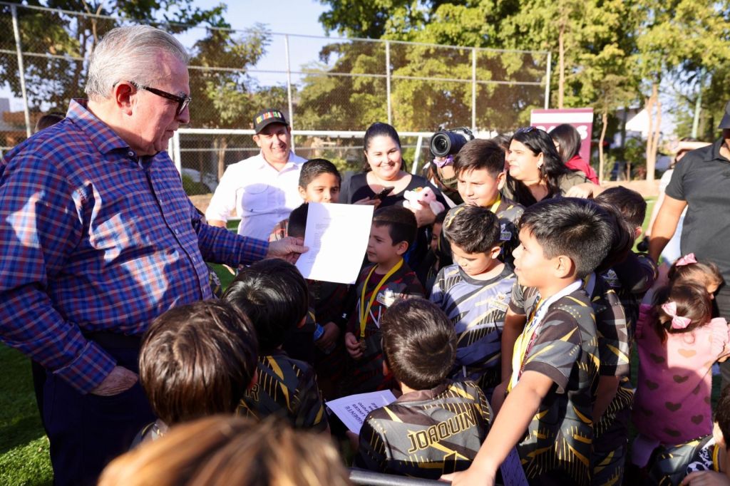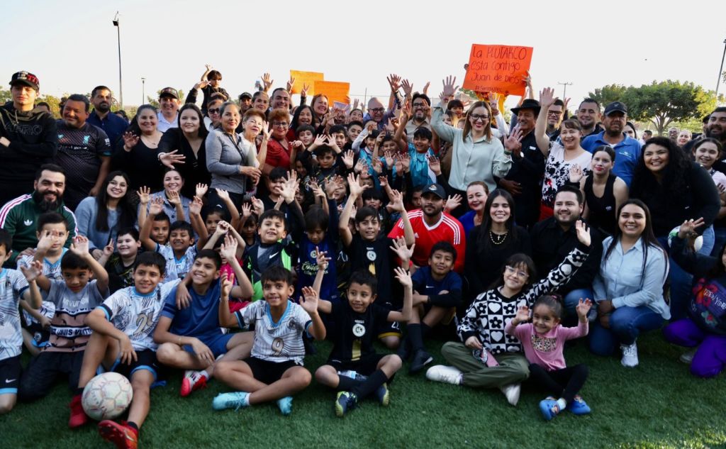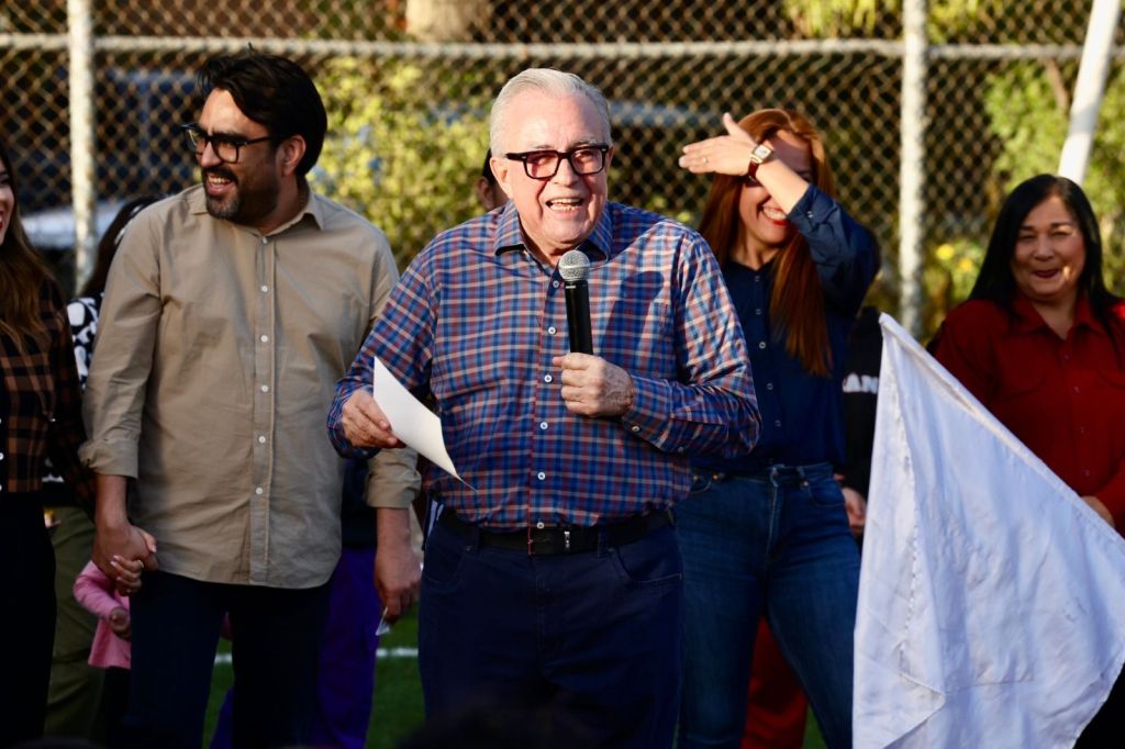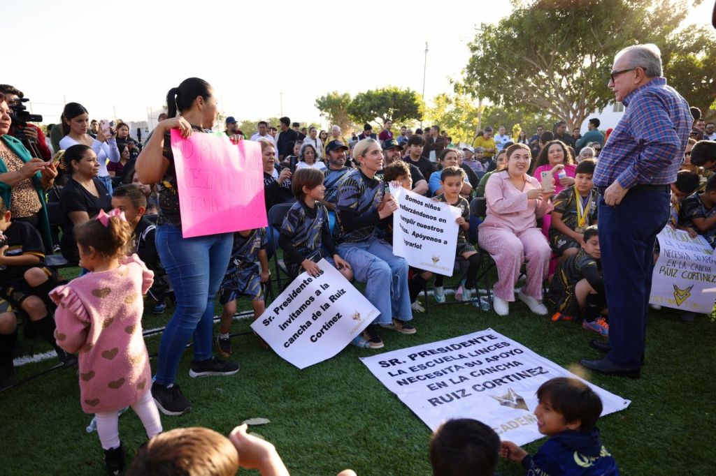 Además, se comprometió a realizar canchas en 3 colonias del sector, derivado de las peticiones hechas por los asistentes. “Los gobiernos de nosotros no mienten, no mienten y no traicionan a la gente. Ya les dije lo vamos a hacer no puedo quedar mal, vamos a atender, tanto a la Plutarco, como a Los Linces de allá de la Ruiz Cortines, como la Estela Ortiz y además aquí, les vamos a hacer la (barda) perimetral y les vamos a poner sus luminarias para que puedan caminar en la noche”, señaló el mandatario estatal.