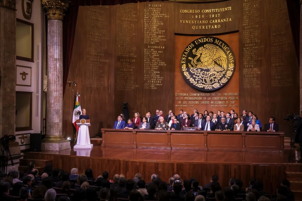 Santiago de Querétaro, Querétaro, 5 de febrero de 2025.- La presidenta de México, Claudia Sheinbaum Pardo, encabezó la conmemoración del 108 aniversario de la Constitución de 1917 en el Teatro de la República. Acompañada por gobernadoras, gobernadores, senadoras, senadores y miembros de su gabinete, destacó la trascendencia histórica de este acto, liderado por primera vez por una mujer y una mandataria de izquierda.