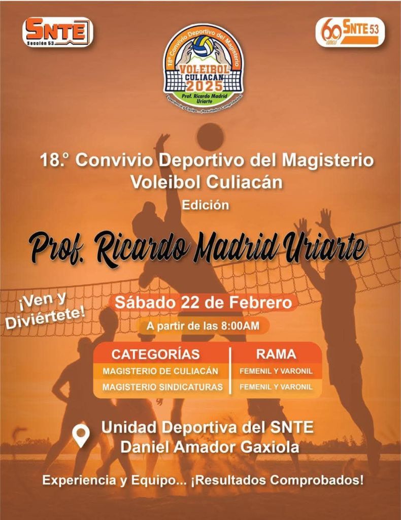 La Sección 53 región Centro te invita a participar y asistir al 18º Convivio Deportivo del Magisterio Voleibol Culiacán 2025, edición Prof. Ricardo Madrid Uriarte.