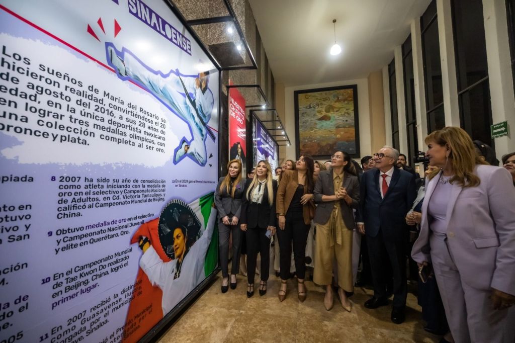 El Ejecutivo estatal Rubén Rocha junto a la homenajeada y diputados, inauguró el corredor María del Rosario Espinoza Espinoza, “Nuestra Chayito de Oro”, en el Congreso del Estado, donde a través de infografía se reconoce la trayectoria de atleta olímpica sinaloense.