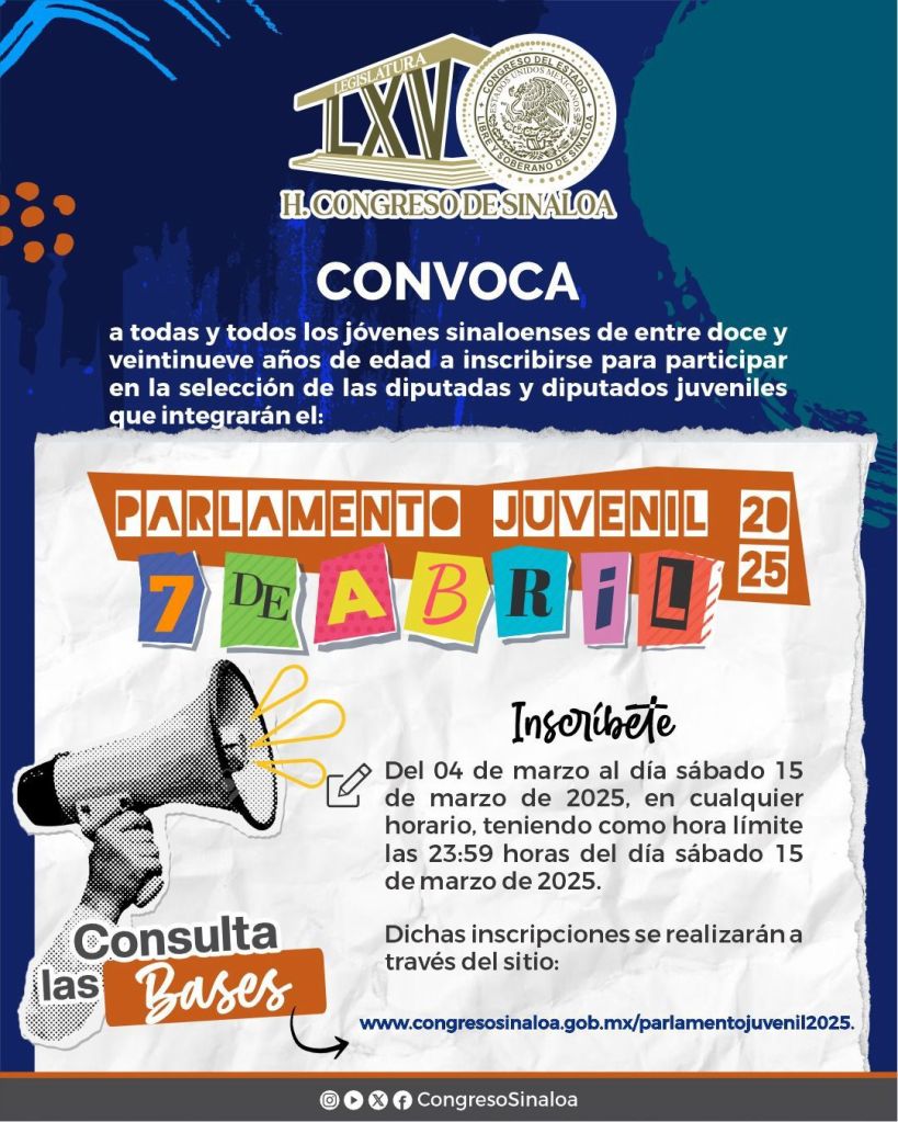 Si tienes entre 12 a 29 años de edad, checa las bases en https://www.congresosinaloa.gob.mx/parlamentojuvenil2025 y regístrate.