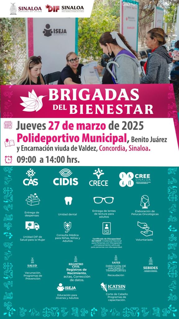 Culiacán, Sinaloa a 24 de marzo de 2025. Con el objetivo de garantizar el acceso a servicios de salud, asistencia social y apoyo alimentario a quienes más lo necesitan, el Sistema DIF Sinaloa, a través de su programa Brigadas del Bienestar, anunció que este jueves 27 de marzo llegará al municipio de Concordia, beneficiando a las familias de la cabecera y comunidades aledañas.