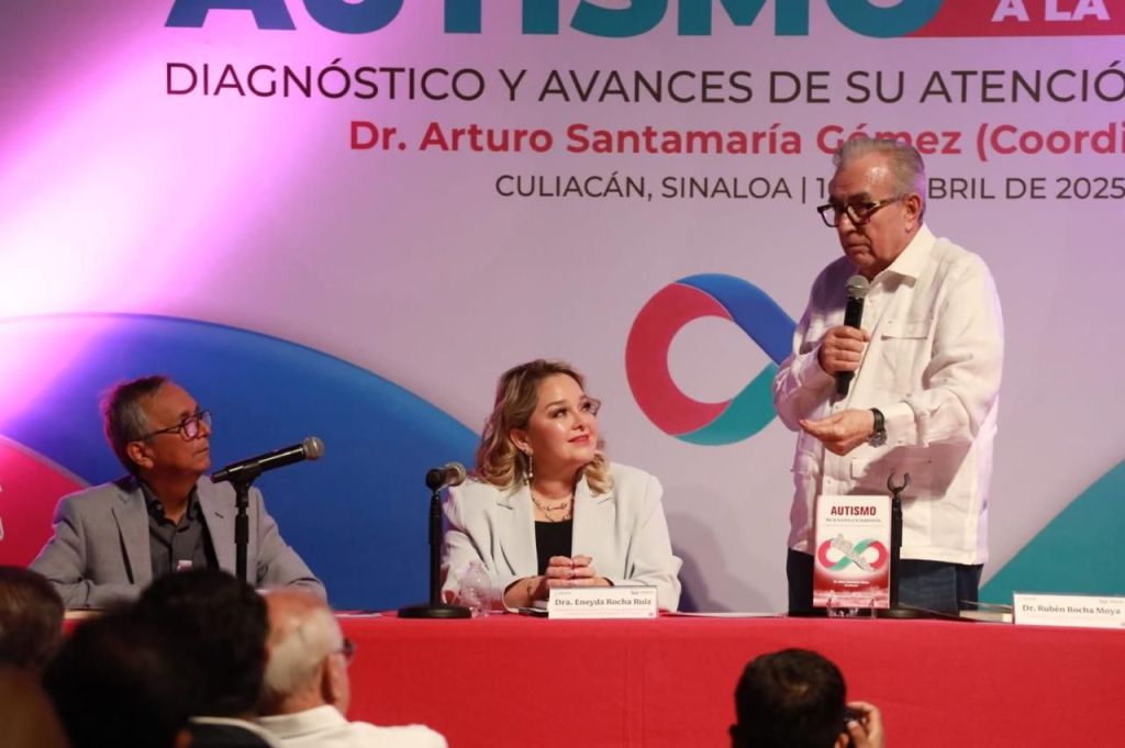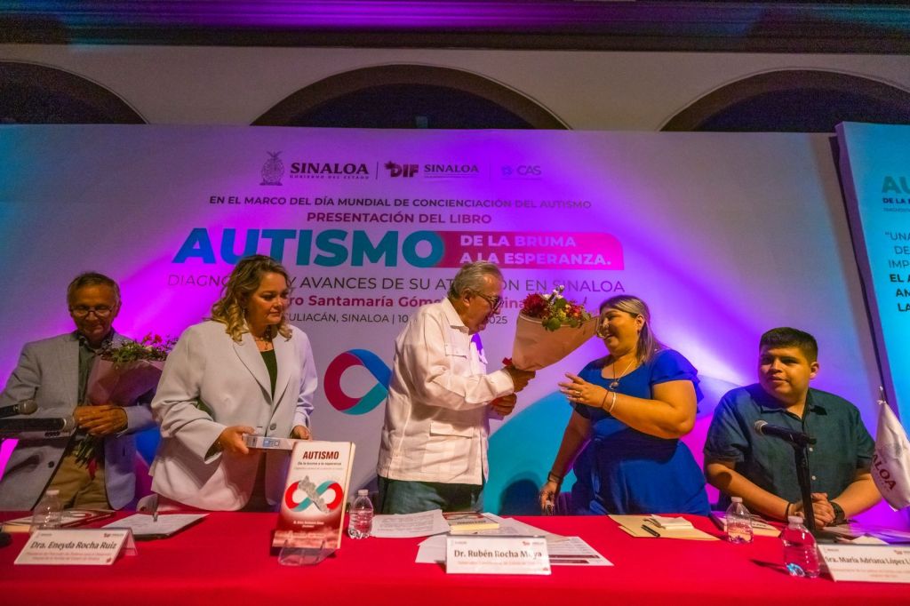 Culiacán, Sinaloa 10 de abril de 2025.-* En el marco de las actividades del Día Internacional de la concienciación del Autismo y como parte del esfuerzo por construir una sociedad más empática y respetuosa, el gobernador Rubén Rocha Moya acompañado de la presidenta del Sistema DIF, Eneyda Rocha Ruiz y Estela María Robledo Conde, directora del Centro de Autismo de Sinaloa, asistieron a la presentación del libro “Autismo, de la bruma a la esperanza. Diagnóstico y avances de su atención en Sinaloa”, un estudio de Arturo Santamaría Gómez, en coordinación con el equipo del CAS.