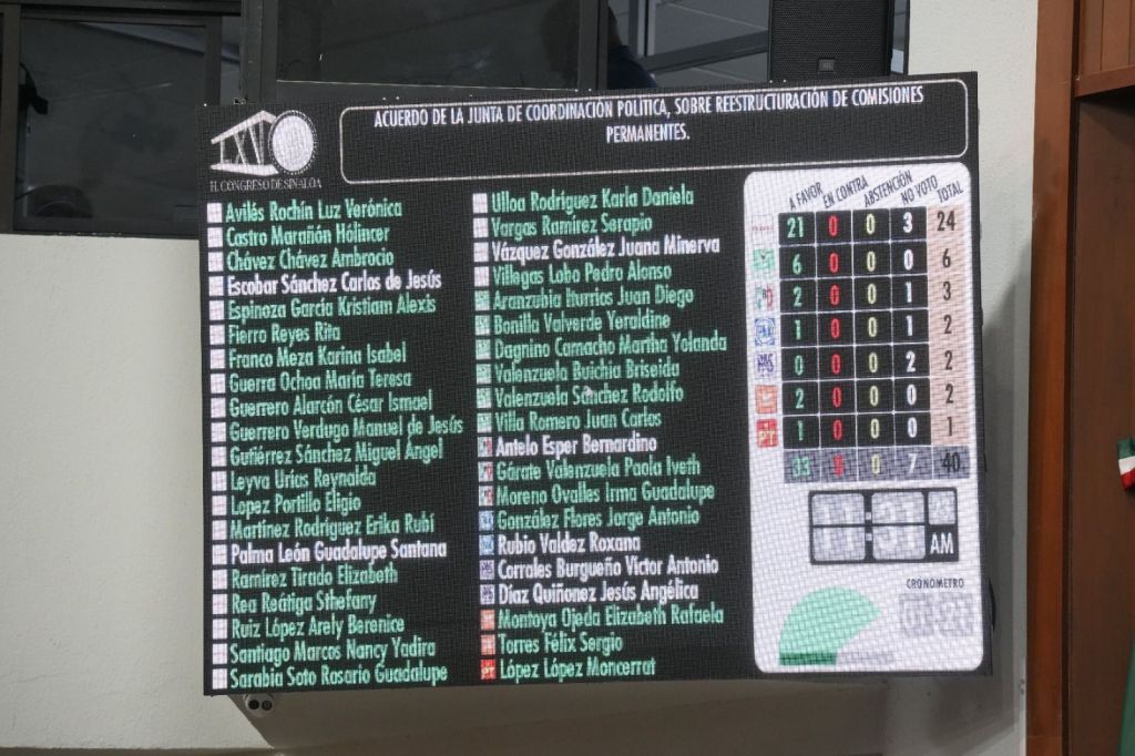 Culiacán, Sinaloa. A 8 de mayo de 2025.- El Pleno del Congreso del Estado de Sinaloa aprobó este jueves el Acuerdo número 049 de la Junta de Coordinación Política, mediante el cual se propuso reestructurar 13 Comisiones Permanentes, luego de que tres diputados se separaron de sus funciones legislativas.