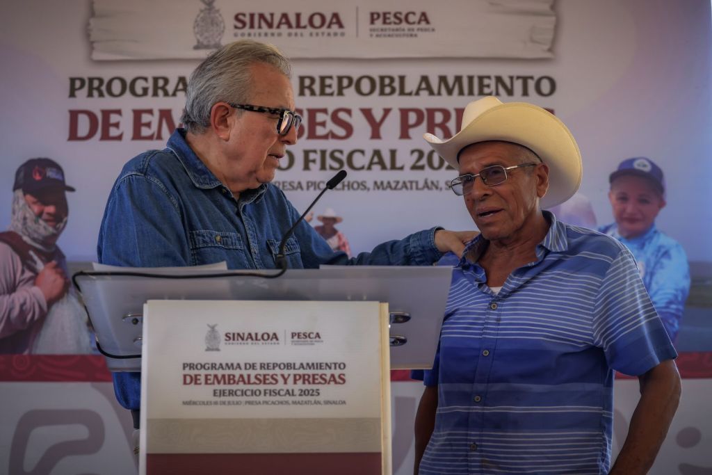 Presa Picachos, Mazatlán, Sinaloa, a 16 de julio de 2025.- En compañía de pescadores de diversas presas del estado, el gobernador Rubén Rocha Moya puso en marcha desde la presa Picachos, en la zona serrana del municipio de Mazatlán, el Programa de Repoblamiento de Presas y Embalses 2025, que consiste en el repoblamiento de 24.5 millones de alevines en las 12 presas que existen en el estado y diversos diques, ubicados en 12 municipios de Sinaloa, y que representa una inversión de 12 millones de pesos.
