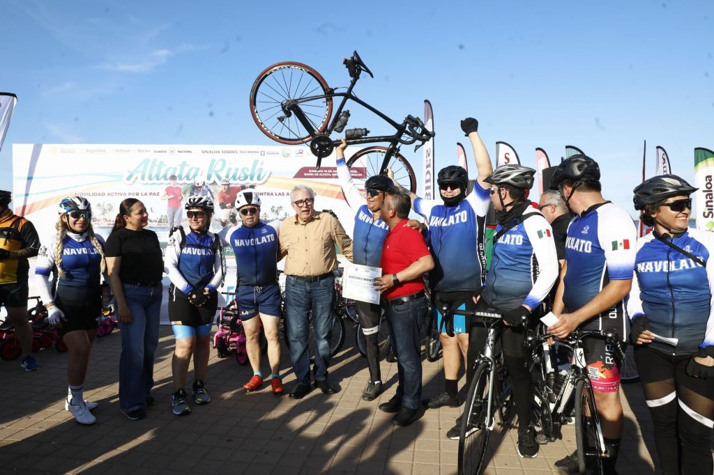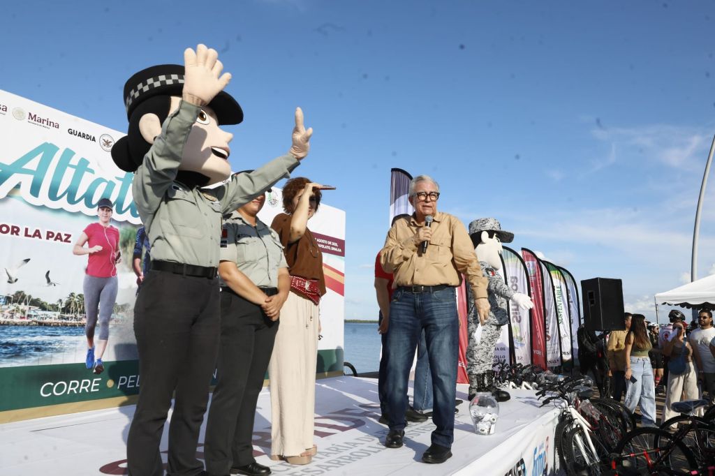 Altata, Navolato, Sinaloa 10 de agosto de 2025. Al encabezar la rifa de premios a los participantes de la Rodada y Carrera por la Paz y contra las Adicciones Altata Rush 2025, el gobernador Rubén Rocha Moya, agradeció a los jóvenes participantes señalando que estas activaciones son una contribución de los deportistas a la paz y seguridad, además a los cuerpos de seguridad y auxilio.