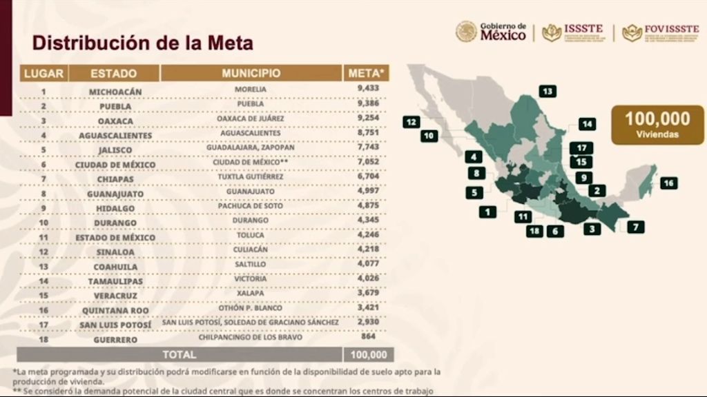 Al respecto, durante la conferencia de esta mañana, se confirmó que la meta nacional 2025 – 2030 de FOVISSSTE es de un total de 100 mil viviendas, de las cuales, 4 mil 218 serán construidas en Sinaloa, como contribución para el programa de Vivienda para el Bienestar.