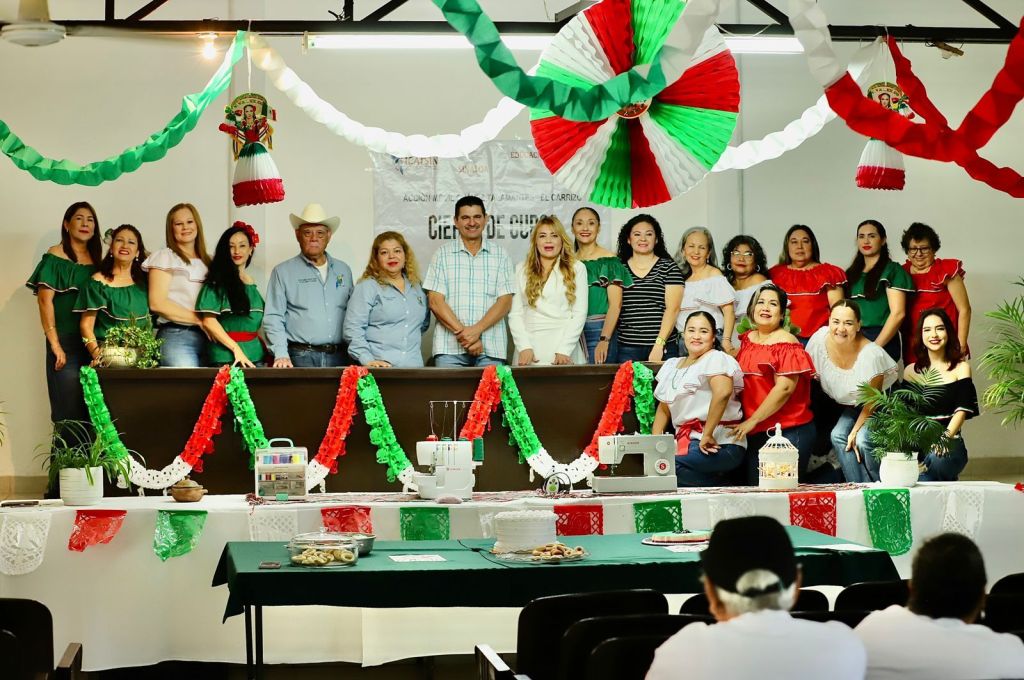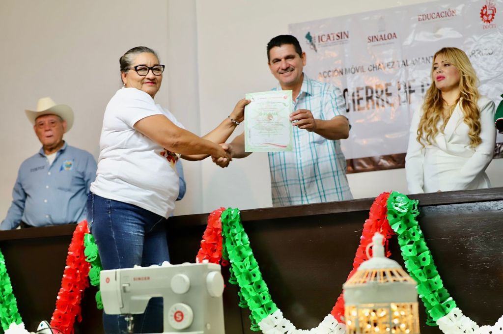 Ahome, Sinaloa; 12 de septiembre de 2025. El Instituto de Capacitación para el Trabajo del Estado de Sinaloa (ICATSIN) llevó a cabo la clausura de cursos en la Casa Ejidal de Chávez Talamantes, donde 45 alumnas concluyeron exitosamente su formación en los cursos de Repostería, Control de costos de alimentos y bebidas y Costura.