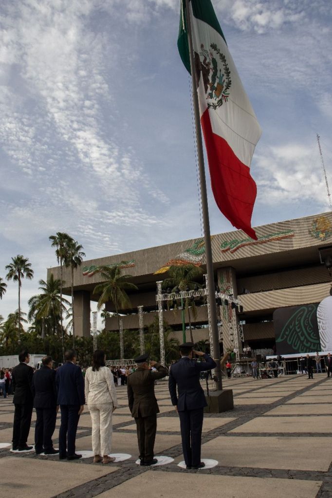Representantes de los tres Poderes de Gobierno participaron en el izamiento bandera, acompañados por los titulares en Sinaloa de Defensa Nacional.