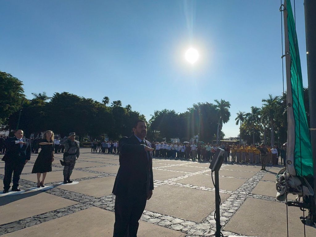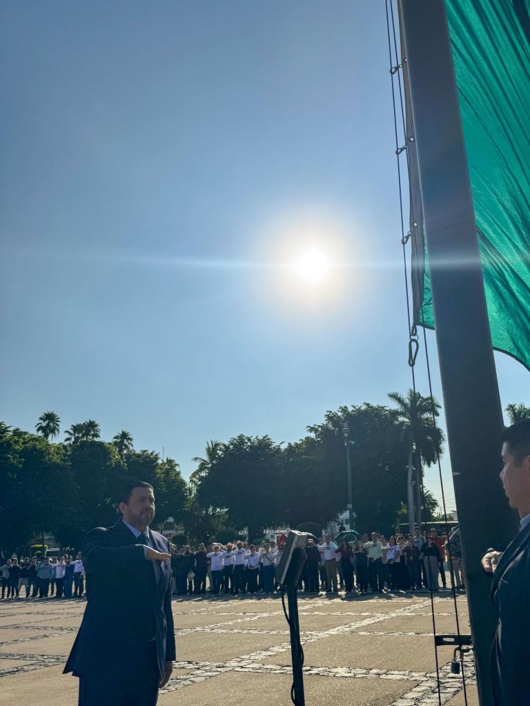 La ceremonia fue encabezada por el secretario de Agricultura y Ganadería, Ismael Bello Esquivel, en representación, del gobierno estatal, acto que inició con el izamiento de la monumental bandera Nacional a toda asta para posteriormente, entonar el himno nacional.