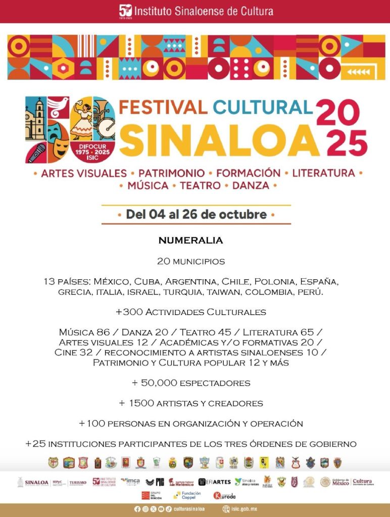 Culiacán, Sinaloa a 02 de Octubre de 2025. El Gobierno del Estado de Sinaloa a tráves del Instituto Sinaloense de Cultura (ISIC), llevará a cabo el Festival Cultural Sinaloa 2025 del 04 al 26 de octubre.