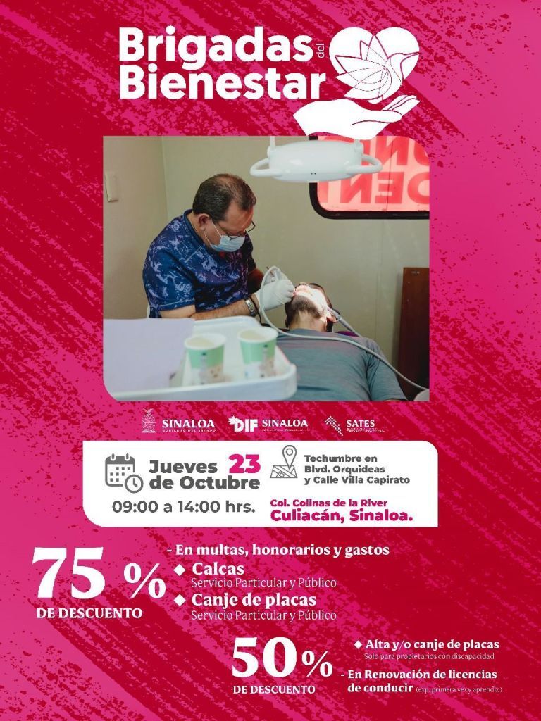 Las Brigadas del Bienestar se llevarán a cabo el próximo jueves 23 de octubre, en la techumbre en Blvd. Orquídeas y calle Villa Capirato de la colonia Colinas de la Rivera, Culiacán, en un horario de atención de 9:00 a 14:00 horas.