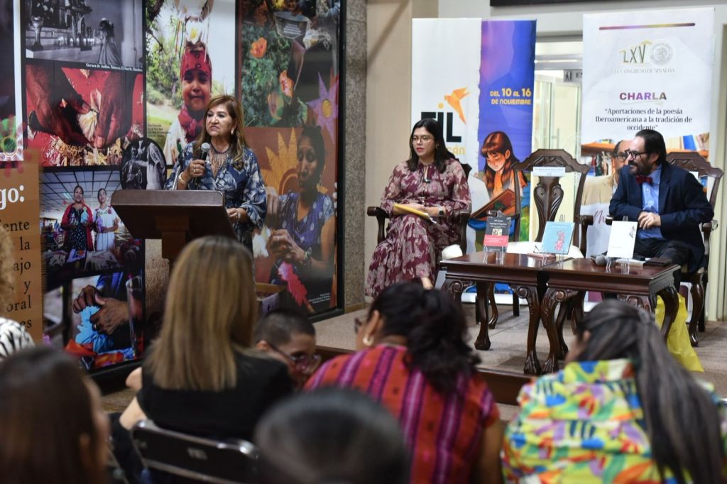 Al emitir mensaje previo al inicio de la charla “Aportaciones de la Poesía Iberoamericana a la Tradición de Occidente», con el poeta Mario Bojórquez, la presidenta de la Junta de Coordinación Política resaltó la organización de este evento, que se da en el marco de la Feria Internacional del Libro que organiza el Ayuntamiento de Culiacán.