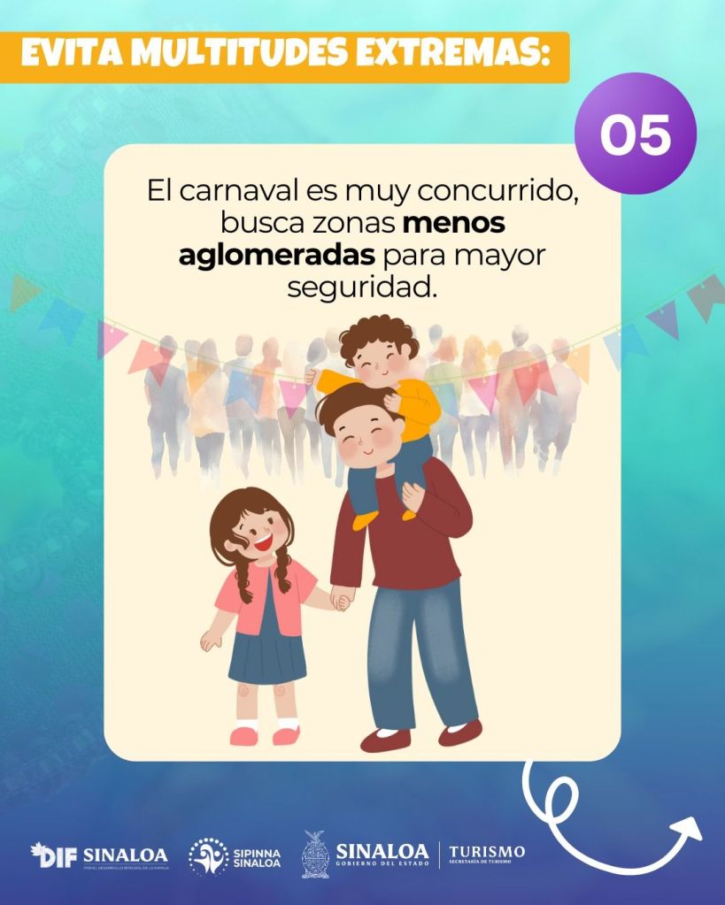 Culiacán, Sinaloa a 20 de enero del 2026. En el marco de las celebraciones culturales, recreativas y tradicionales que se desarrollan en diversos municipios del estado de Sinaloa, como carnavales, desfiles y concursos infantiles, el Gobierno del Estado, a través de DIF Sinaloa, la Secretaría de Turismo y la Secretaría Ejecutiva del Sistema Estatal de Protección Integral de Niñas, Niños y Adolescentes (SIPINNA) hacen un llamado a las autoridades, organizadores de eventos y a la sociedad en general a priorizar el enfoque de derechos y la prevención.