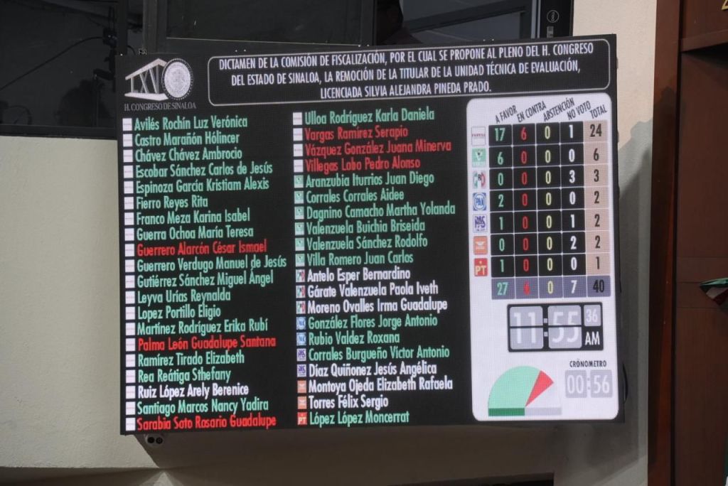 En el dictamen aprobado se establece que “Se declara actualizada la causal de remoción por ineficiencia prevista en el primer párrafo, del artículo 11, del Reglamento Interior de la Unidad Técnica de Evaluación, a cargo de la C. Silvia Alejandra Pineda Prado, Titular de la Unidad Técnica de Evaluación del H. Congreso del Estado de Sinaloa”.