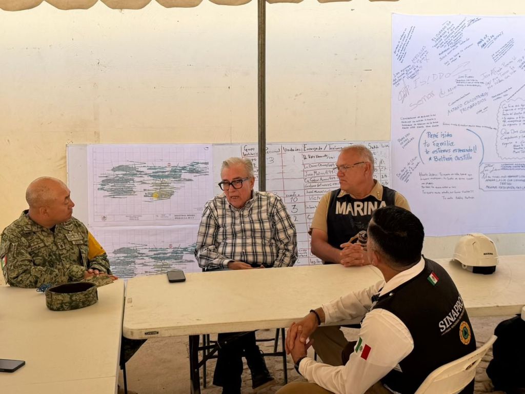 Rosario, Sinaloa, a 9 de abril de 2026. Pendiente del operativo para rescatar al minero que aún permanece en la mina Santa Fe, el gobernador Rubén Rocha Moya, visitó, la tarde de hoy, la zona de búsqueda en el municipio serrano, donde se reunió con personal que encabeza las tareas de rescate.