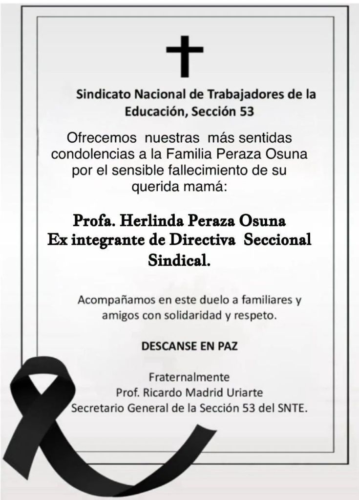 SNTE 53 Publicado el 19 abril, 2026 por cuateavena Nuestras más sentidas condolencias Compártelo: Compartir en X (Se abre en una ventana nueva) X Comparte en Facebook (Se abre en una ventana nueva) Facebook Me gusta Cargando... Relacionado