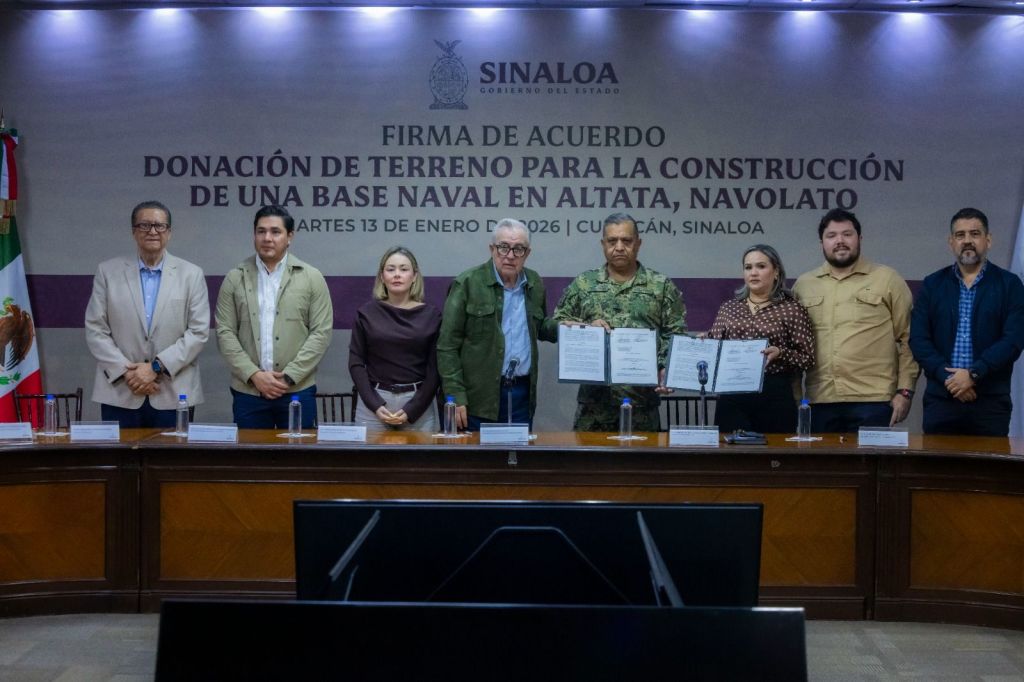 Culiacán, Sinaloa, a 13 de enero de 2026.- Para concretar el proyecto de la instalación de un Sector Naval en Nuevo Altata, en el municipio de Navolato, el gobernador Rubén Rocha Moya signó un acuerdo de donación de un predio con el comandante de la Cuarta Región Naval, vicealmirante José Daniel Reséndiz Sandoval, lo cual vendrá a dar mayor seguridad y confianza tanto a residentes como visitantes de este destino turístico, con la presencia permanente de mil 100 elementos de la Secretaría de Marina.