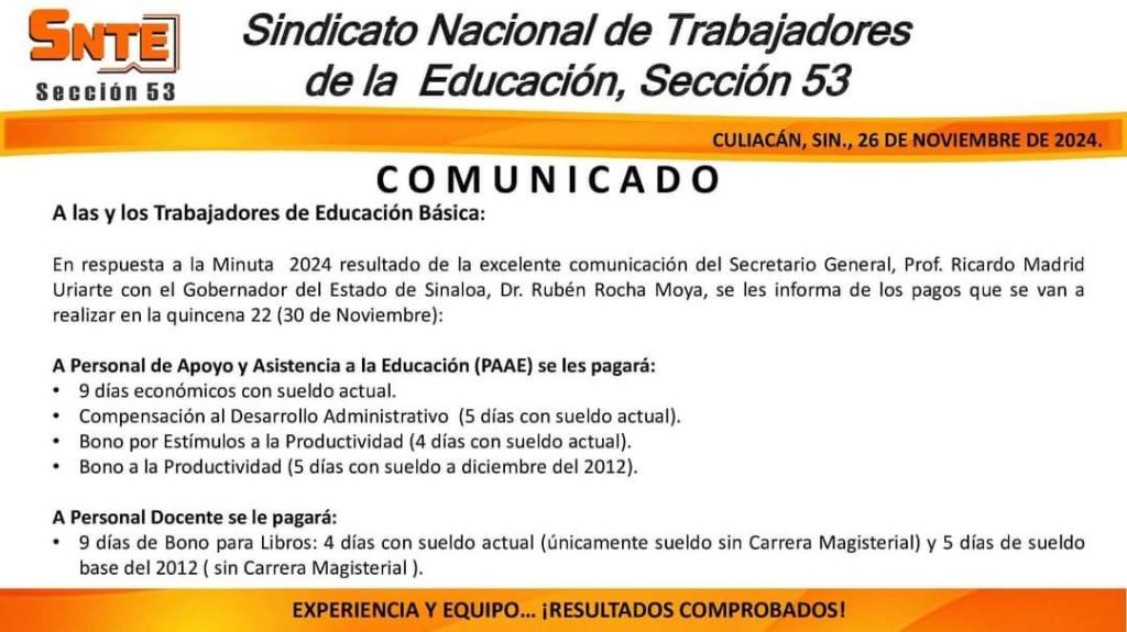COMUNICADO TRABAJADORES DE EDUCACIÓN BÁSICA. Publicado el 26 noviembre, 2024 por cuateavena Continúa leyendo COMUNICADO TRABAJADORES DE EDUCACIÓN BÁSICA.